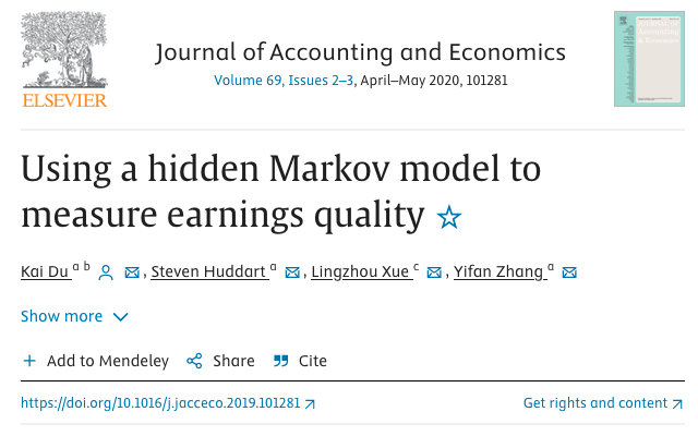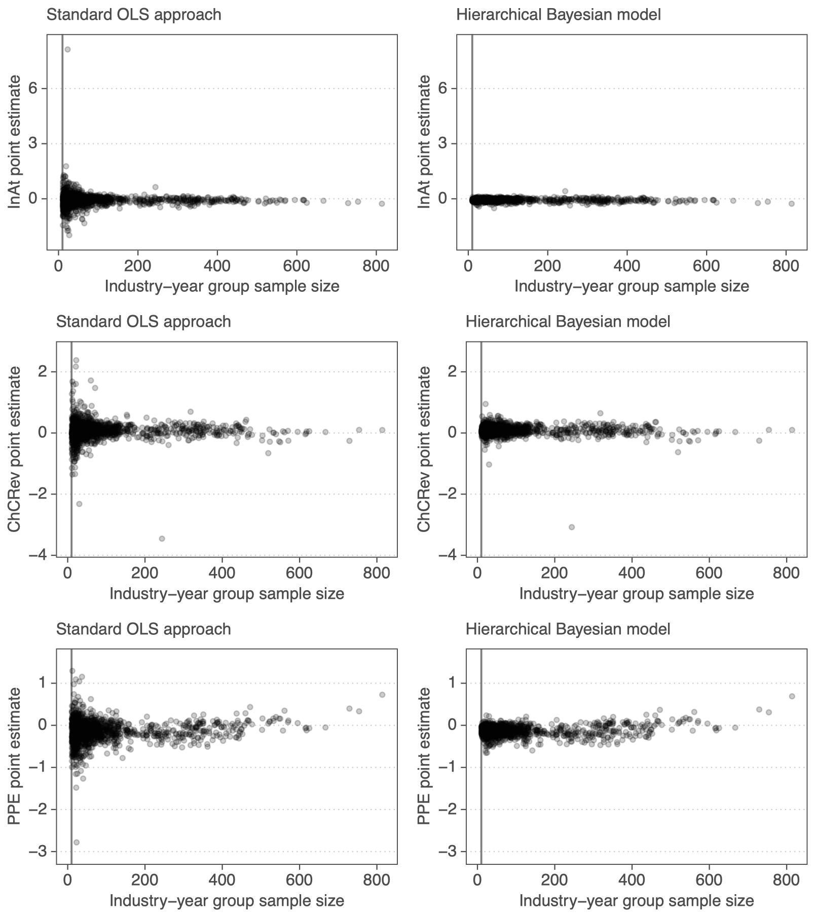 \[ \begin{align} TA_{ijt} & = \beta_{0,jt}InvAt_{ijt-1} + \beta_{1,jt}\triangle CRev_{ijt}\\\nonumber & + \beta_{2,jt}PPE_{ijt} \end{align} \]