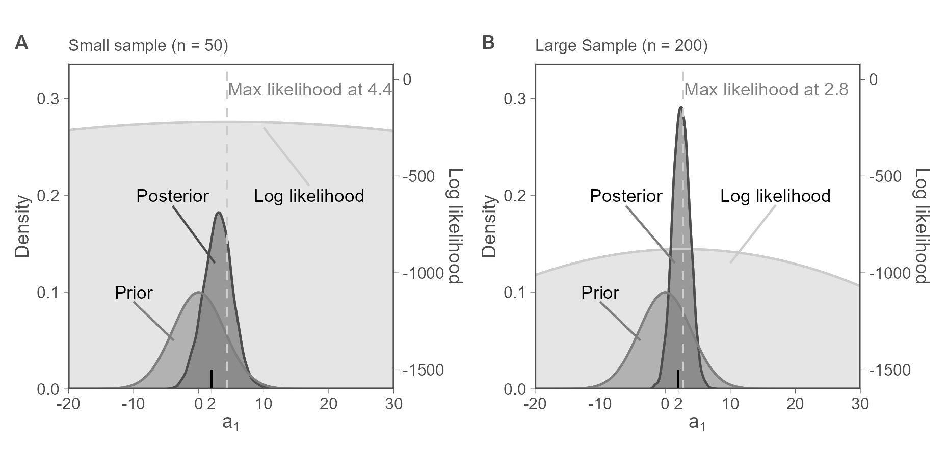 Our posterior beliefs about \(a_1\) have moved closer to the truth.