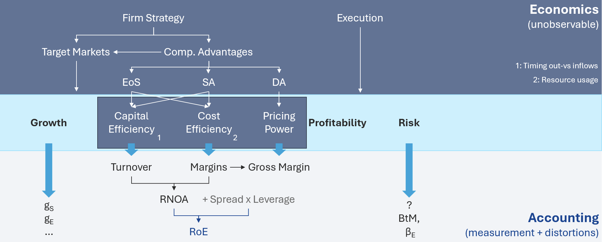 To summarize, this chapter introduced a top-down system of ratios aimed at analyzing the determinants of profitability. It decomposes \(ROE\) into three main sources of profitability: (1) efficient use of operating assets, (2) pricing power and cost advantages, and (3) leverage effects. Then it drills further into possible main drivers of each of the 3 cases. We discussed how ratios tell us what business model a firm is following and whether it works well. Figure 4.9 summarizes this rationale. The economics of a firm are driven by management’s strategy and execution. It involves two main decisions: a) which markets does the firm want to operate in and b) what are the ways in which it wants to ‘win’ in those markets (i.e., what competitive advantages does it want to cultivate? Economies of scales, supply, or demand advantages?). Those advantages, among other things, should transalte into either higher capital efficiency, cost efficiency, or pricing power than the competition. Neither of the three aspects is directly observable. Accounting can inform about all three, but one should never forget that accounting is a measurement system that relies on estimates and sometimes does not capture all of the firm’s resources or mismeasures resource usage. What we discussed in this chapter is how we can use ratio frameworks like the advanced dupont decomposition to compute ratios follows exactly this logic and can help us asses the key components of a firm’s strategy in a structured and principled way.