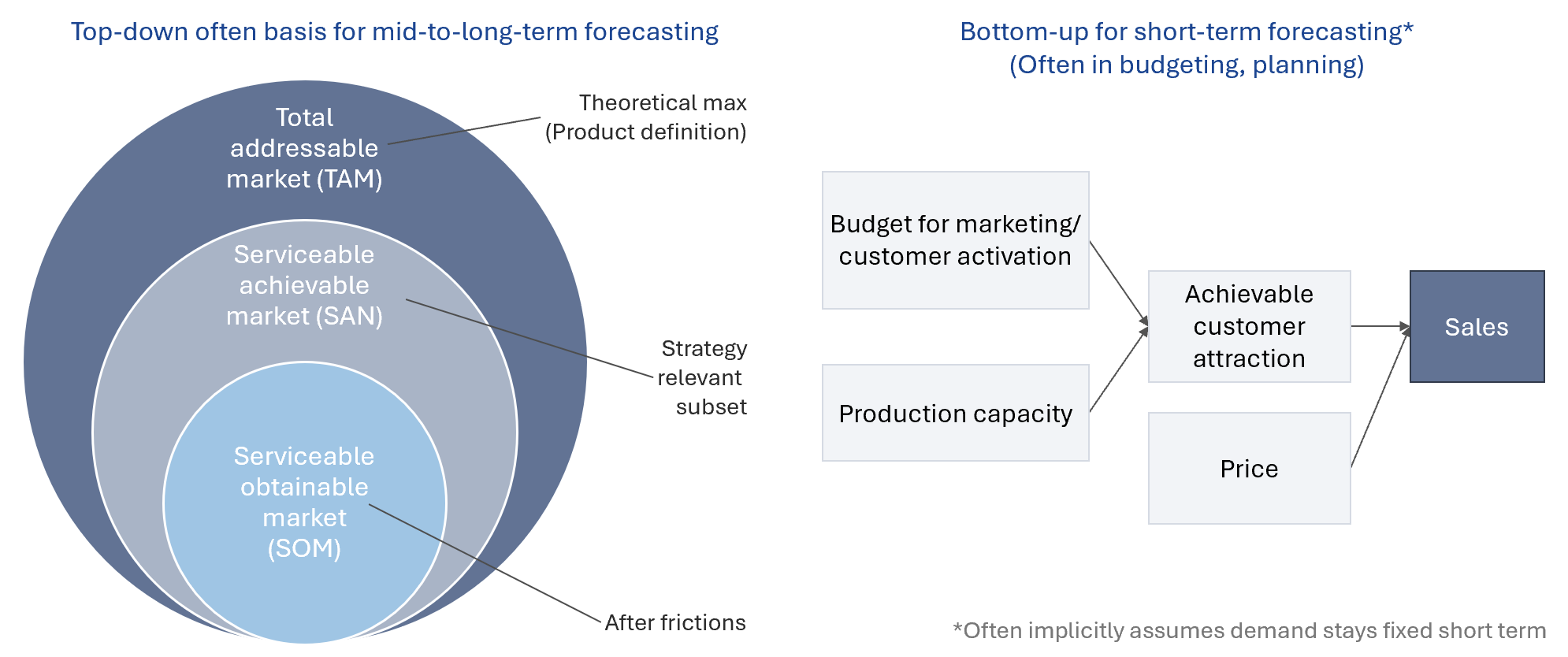 The top-down approach uses a simple decomposition of sales into \(\text{Sales}_t = \text{Market Size}_t \times \text{Market Share}_t \times \text{Price}_t\). We start by sizing the total addressable market, then restricting the market size to the part actually serviceable, and then we try to forecast market share. Together, this equals volume, which multiplied by price equals sales. If the firm is in multiple markets (different products, services, or distinct regions), we want to forecast each of these markets separately, in as much detail as high-quality data allows us to do so.